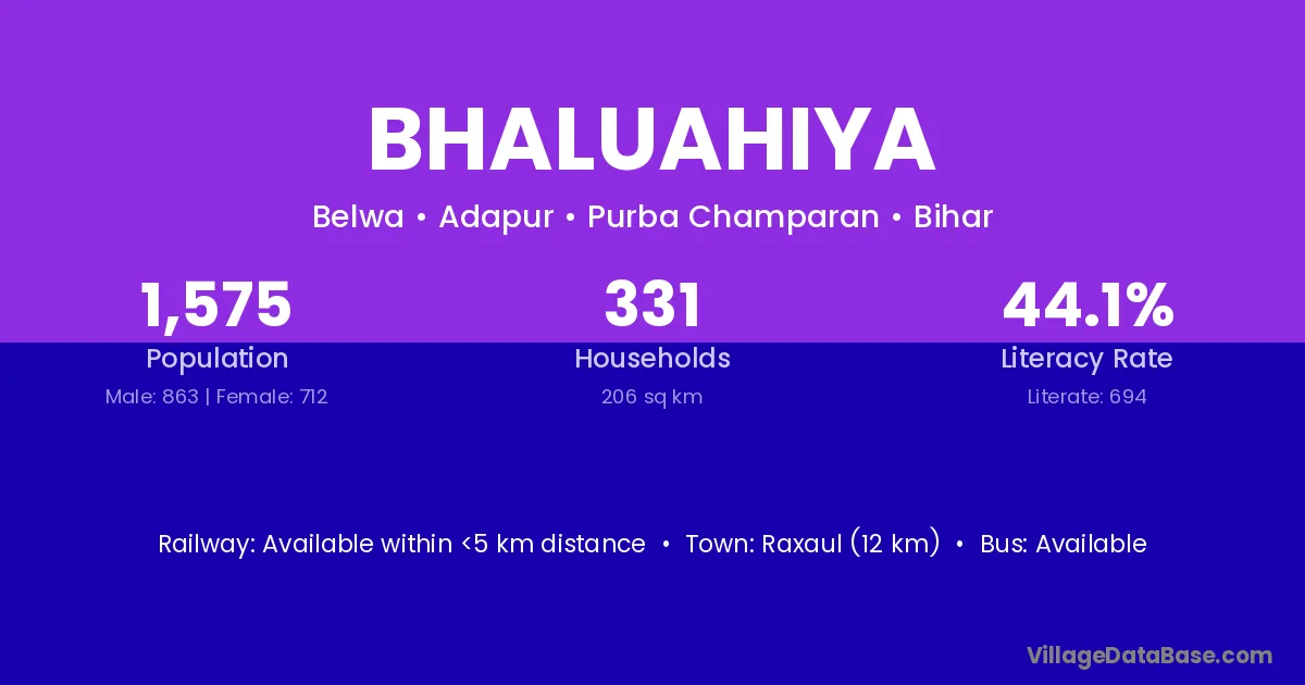 Raxaul (12 km) is the nearest town to Bhaluahiya village for major economic activities and is located approximately 12 km away.