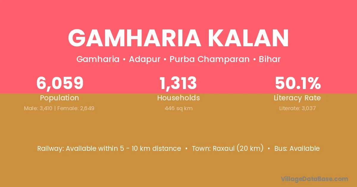 Raxaul (20 km) is the nearest town to Gamharia Kalan village for major economic activities and is located approximately 20 km away.