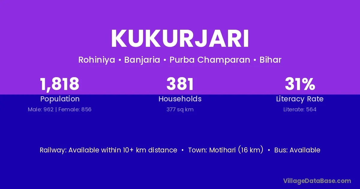 Motihari (16 km) is the nearest town to Kukurjari village for major economic activities and is located approximately 16 km away.