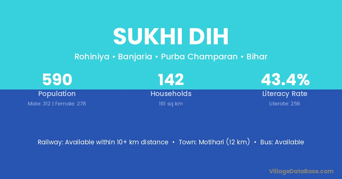 Motihari (12 km) is the nearest town to Sukhi Dih village for major economic activities and is located approximately 12 km away.