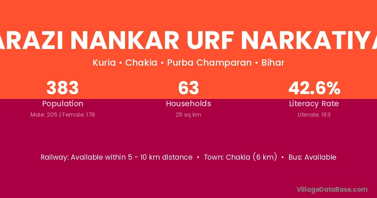 Arazi Nankar Urf Narkatiya village has a total population of 383 people, of which 205 are males and 178 are females.