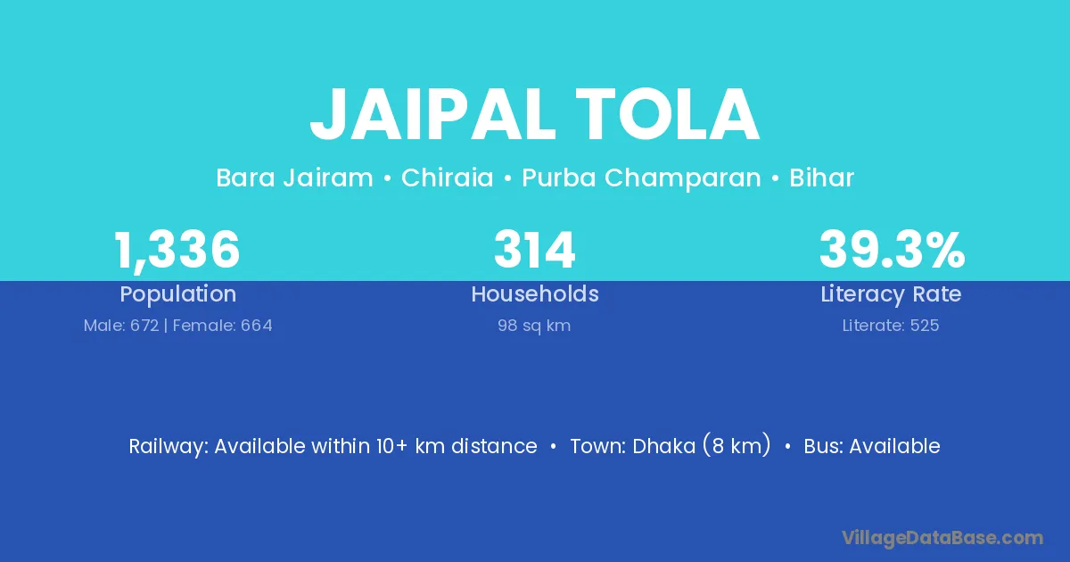 Jaipal Tola village has a total population of 1,336 people, of which 672 are males and 664 are females.