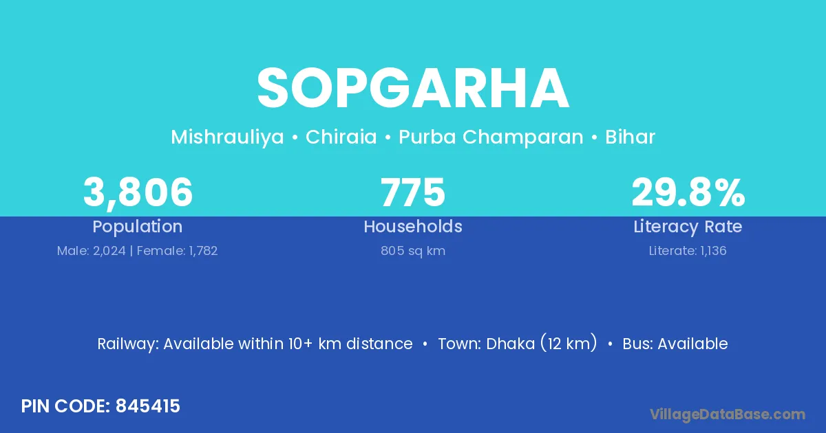 Dhaka (12 km) is the nearest town to Sopgarha village for major economic activities and is located approximately 12 km away.