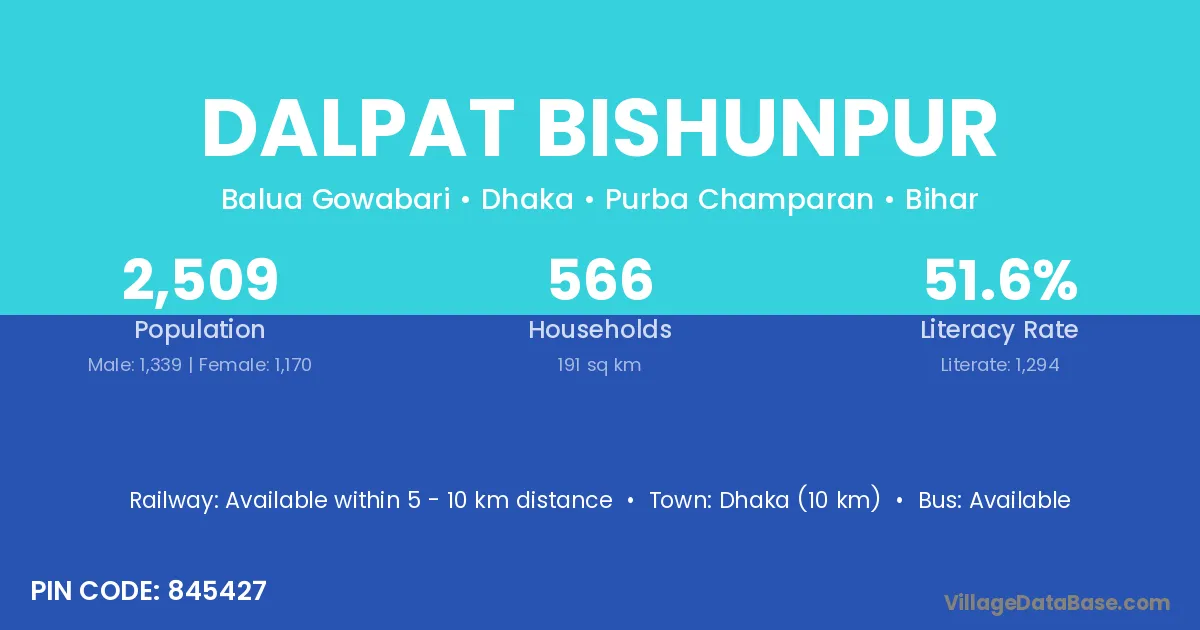Dhaka (10 km) is the nearest town to Dalpat Bishunpur village for major economic activities and is located approximately 10 km away.