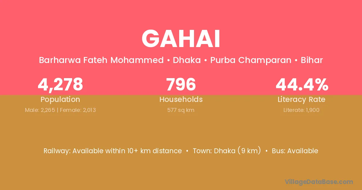 Dhaka (9 km) is the nearest town to Gahai village for major economic activities and is located approximately 9 km away.
