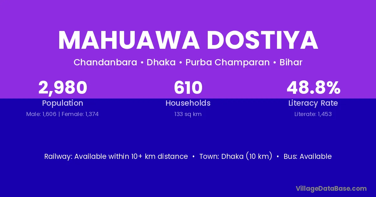 Dhaka (10 km) is the nearest town to Mahuawa Dostiya village for major economic activities and is located approximately 10 km away.