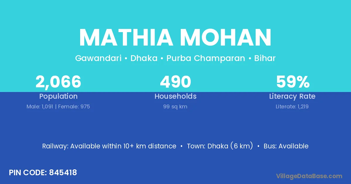 Mathia Mohan village has a total population of 2,066 people, of which 1,091 are males and 975 are females.