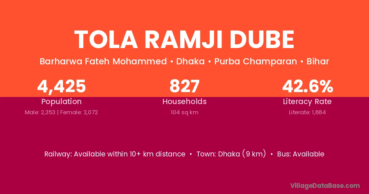 Tola Ramji Dube village has a total population of 4,425 people, of which 2,353 are males and 2,072 are females.