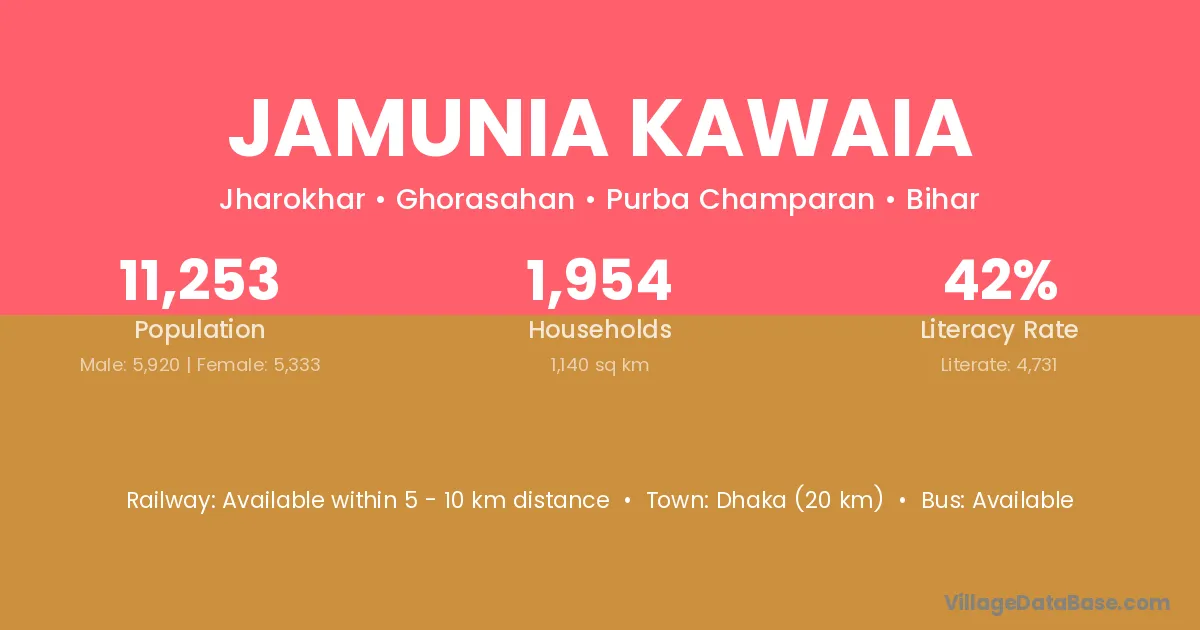 Jamunia Kawaia village has a total population of 11,253 people, of which 5,920 are males and 5,333 are females.