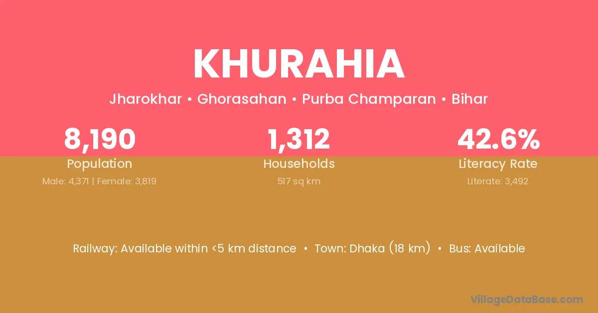 Dhaka (18 km) is the nearest town to Khurahia village for major economic activities and is located approximately 18 km away.