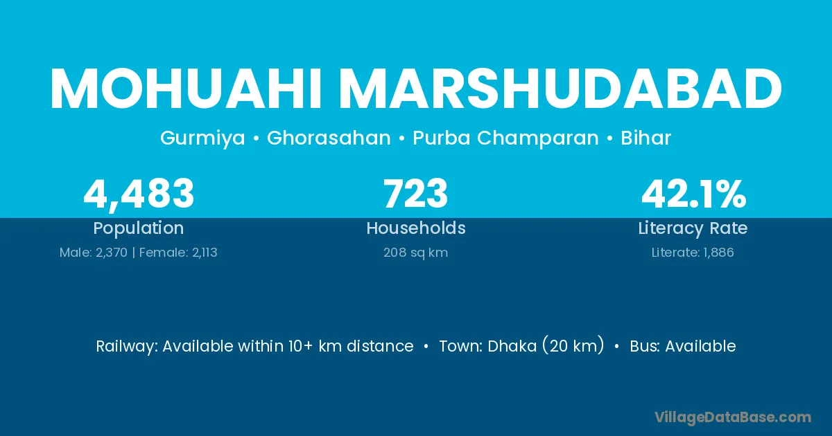 Mohuahi Marshudabad village has a total population of 4,483 people, of which 2,370 are males and 2,113 are females.
