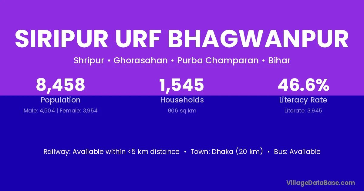 Dhaka (20 km) is the nearest town to Siripur Urf Bhagwanpur village for major economic activities and is located approximately 20 km away.