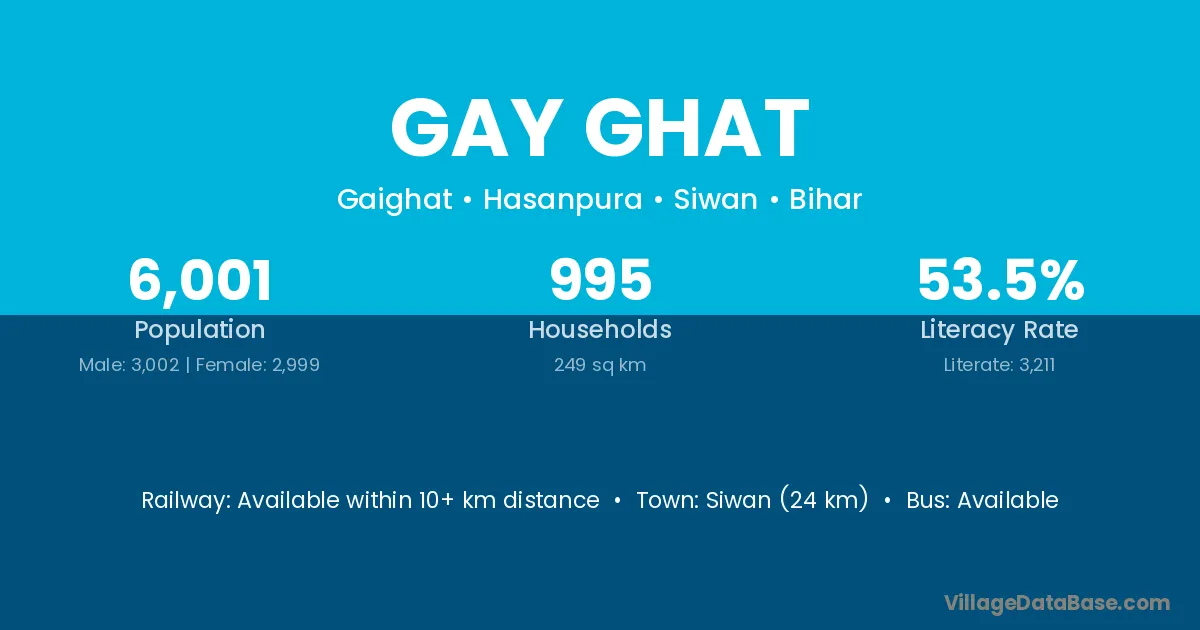 The literacy rate of Gay Ghat village is 47.59%. Male literacy stands at 56.28% and female literacy at 38.20%.