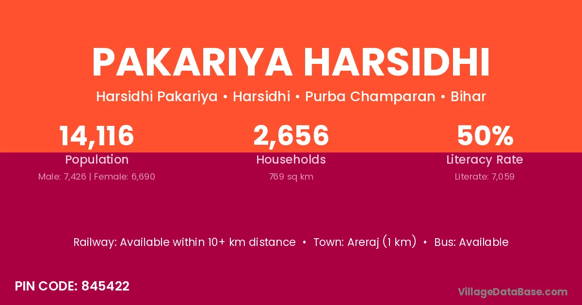 Areraj (1 km) is the nearest town to Pakariya Harsidhi village for major economic activities and is located approximately 1 km away.