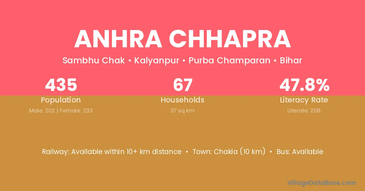 Anhra Chhapra village has a total population of 435 people, of which 202 are males and 233 are females.