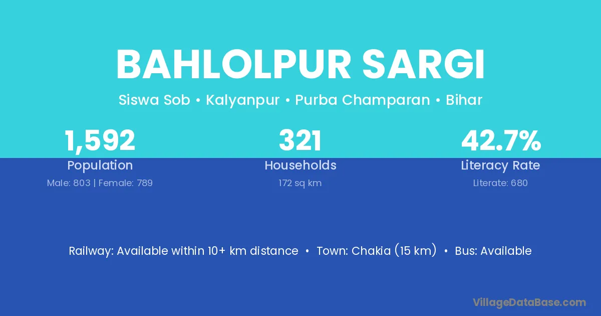 Chakia (15 km) is the nearest town to Bahlolpur Sargi village for major economic activities and is located approximately 15 km away.
