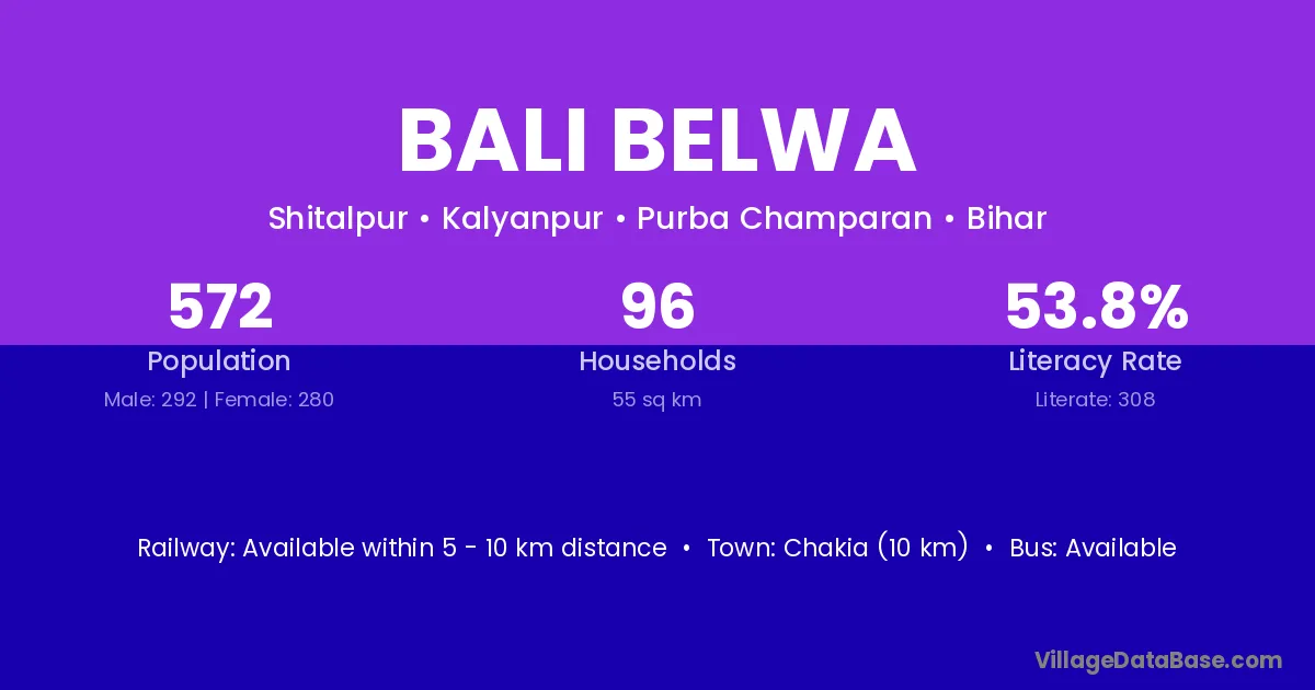 Chakia (10 km) is the nearest town to Bali Belwa village for major economic activities and is located approximately 10 km away.