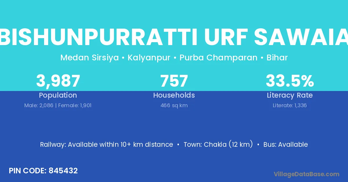 Chakia (12 km) is the nearest town to Bishunpurratti Urf Sawaia village for major economic activities and is located approximately 12 km away.