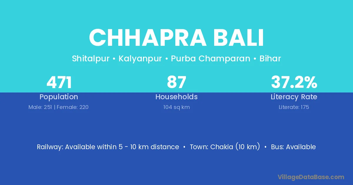 Chakia (10 km) is the nearest town to Chhapra Bali village for major economic activities and is located approximately 10 km away.