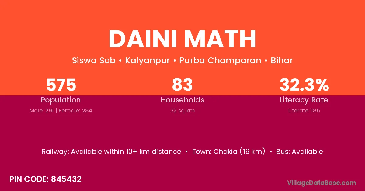 Chakia (19 km) is the nearest town to Daini Math village for major economic activities and is located approximately 19 km away.