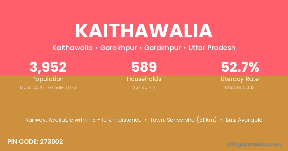 The literacy rate of Kaithawalia village is 46.10%. Male literacy stands at 55.35% and female literacy at 36.18%.