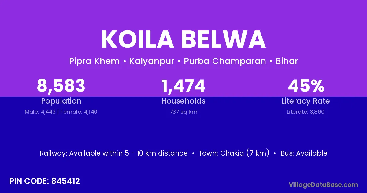 Chakia (7 km) is the nearest town to Koila Belwa village for major economic activities and is located approximately 7 km away.