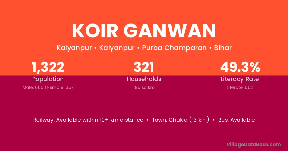 Chakia (13 km) is the nearest town to Koir Ganwan village for major economic activities and is located approximately 13 km away.