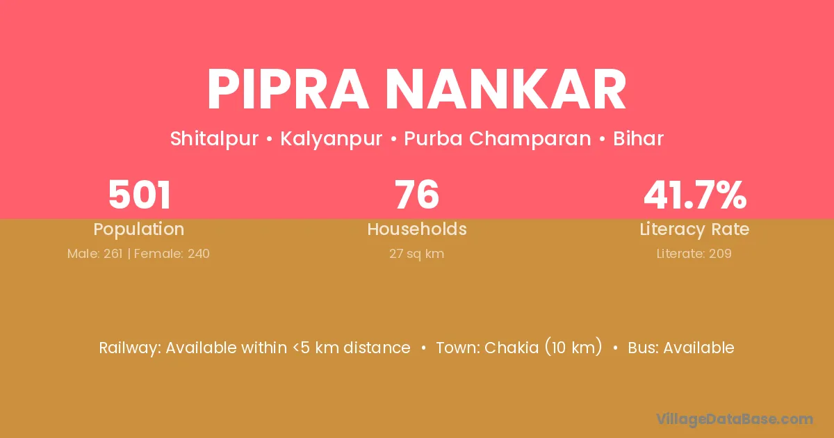 Pipra Nankar village has a total population of 501 people, of which 261 are males and 240 are females.