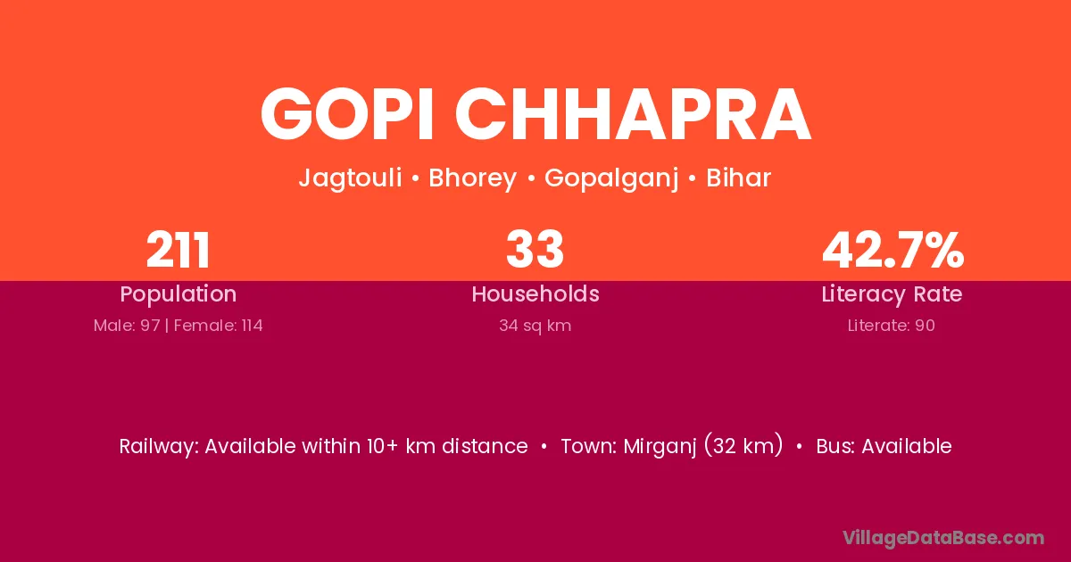 Motihari (30 km) is the nearest town to Gopi Chhapra village for major economic activities and is located approximately 30 km away.