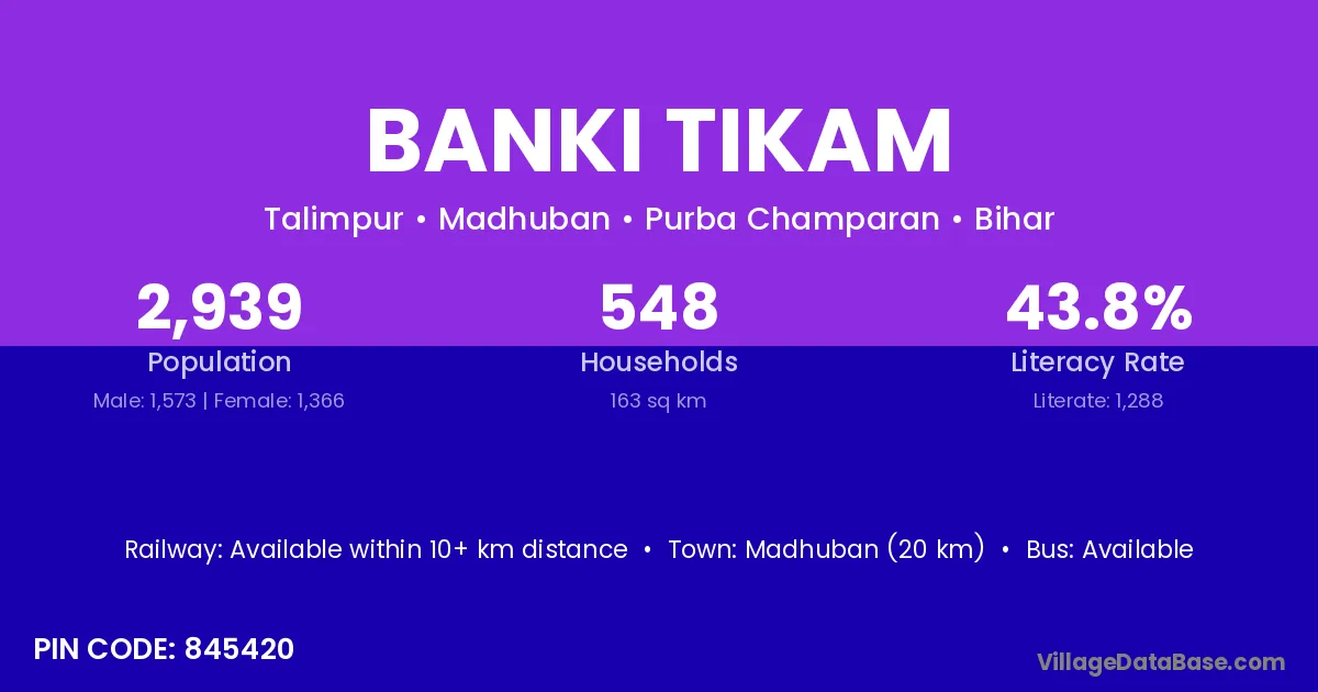 Madhuban (20 km) is the nearest town to Banki Tikam village for major economic activities and is located approximately 20 km away.