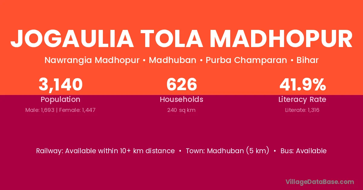Madhuban (5 km) is the nearest town to Jogaulia Tola Madhopur village for major economic activities and is located approximately 5 km away.