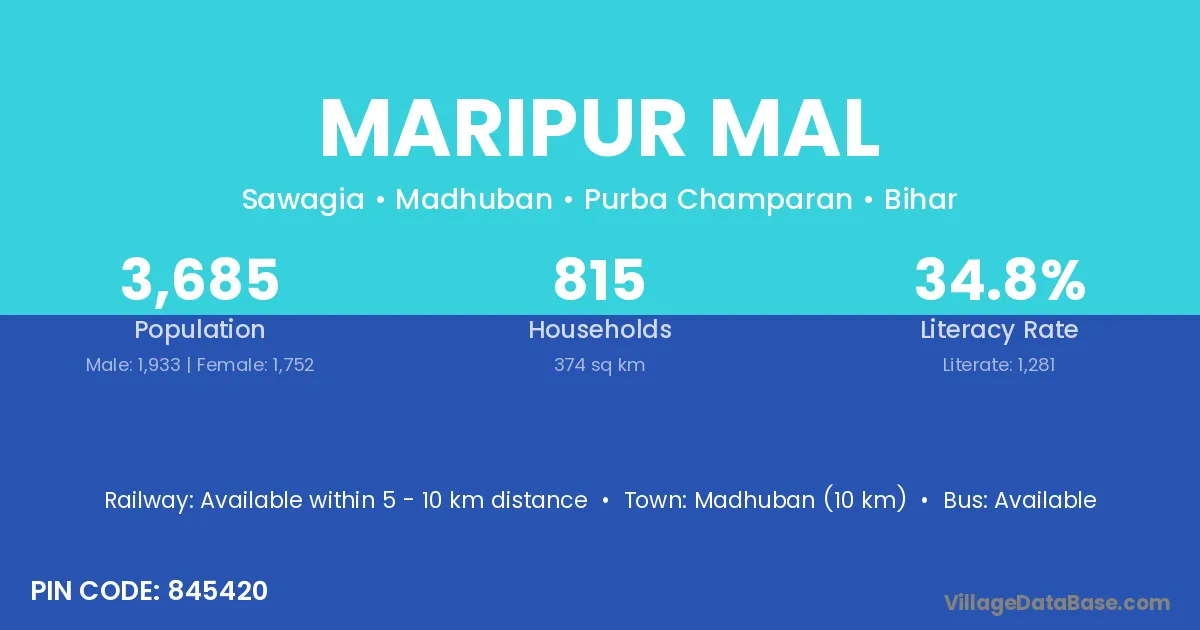 Madhuban (10 km) is the nearest town to Maripur Mal village for major economic activities and is located approximately 10 km away.