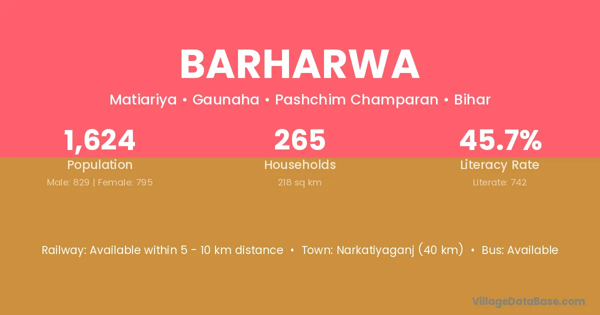 Mehsi (8 km) is the nearest town to Barharwa village for major economic activities and is located approximately 8 km away.