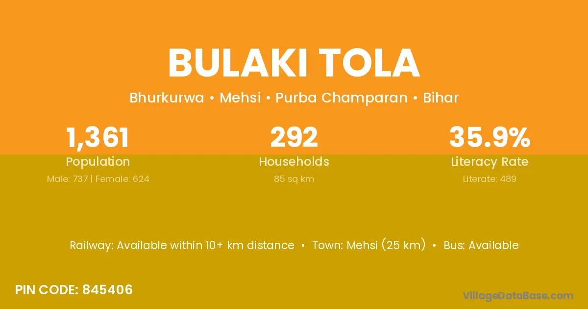 Mehsi (25 km) is the nearest town to Bulaki Tola village for major economic activities and is located approximately 25 km away.