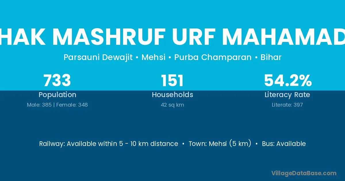 Mehsi (5 km) is the nearest town to Chak Mashruf Urf Mahamada village for major economic activities and is located approximately 5 km away.