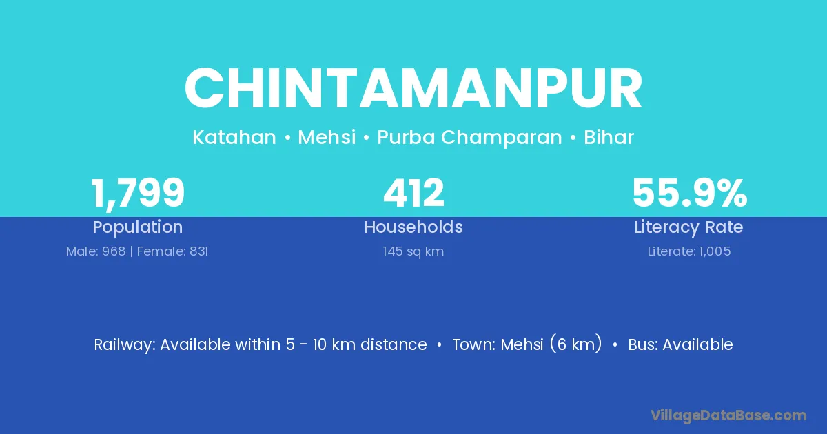 Mehsi (6 km) is the nearest town to Chintamanpur village for major economic activities and is located approximately 6 km away.