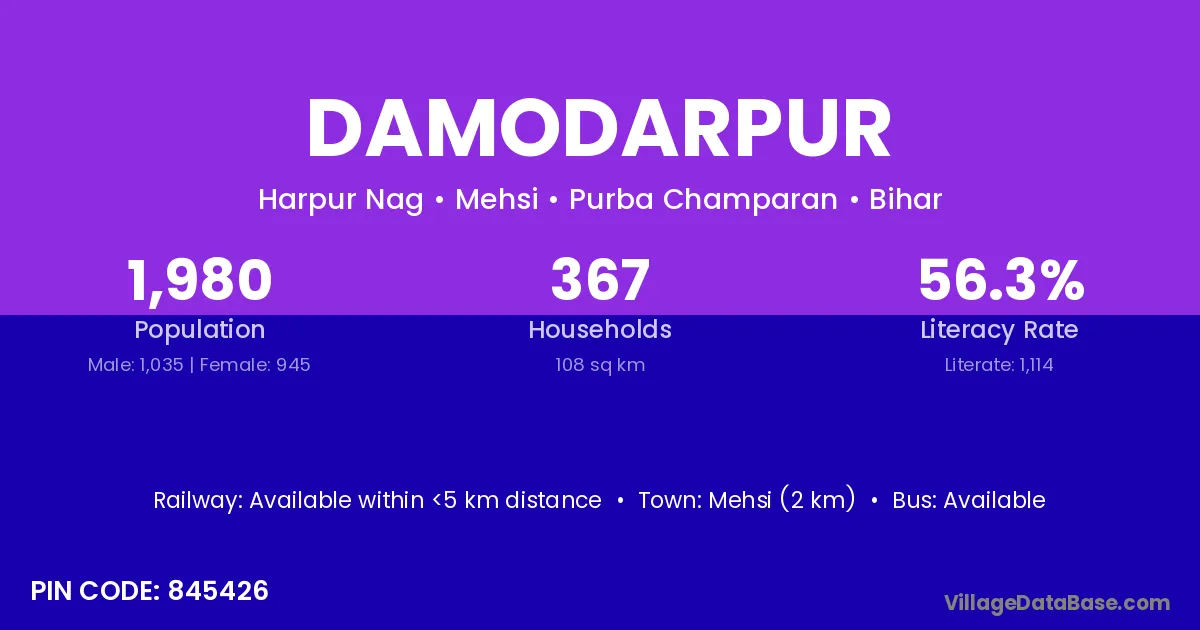 Mehsi (2 km) is the nearest town to Damodarpur village for major economic activities and is located approximately 2 km away.