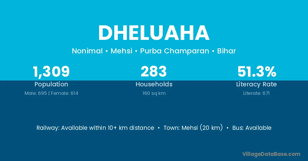 Mehsi (20 km) is the nearest town to Dheluaha village for major economic activities and is located approximately 20 km away.