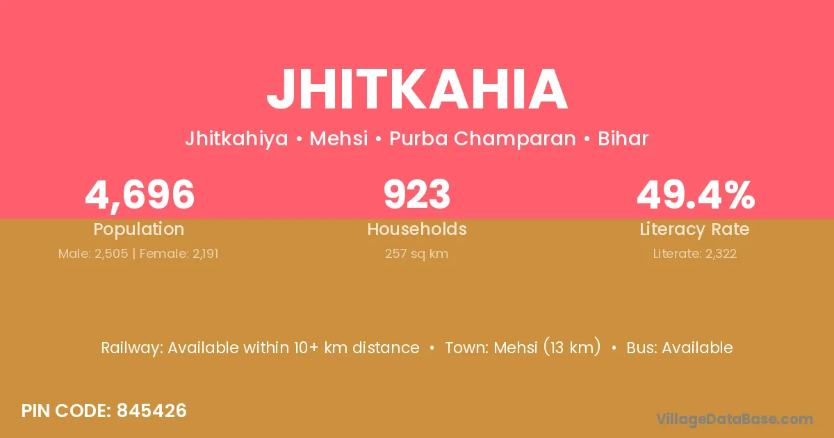 Mehsi (13 km) is the nearest town to Jhitkahia village for major economic activities and is located approximately 13 km away.