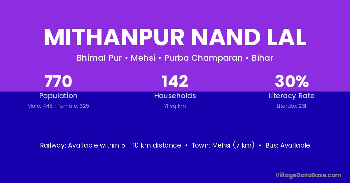 Mehsi (7 km) is the nearest town to Mithanpur Nand Lal village for major economic activities and is located approximately 7 km away.