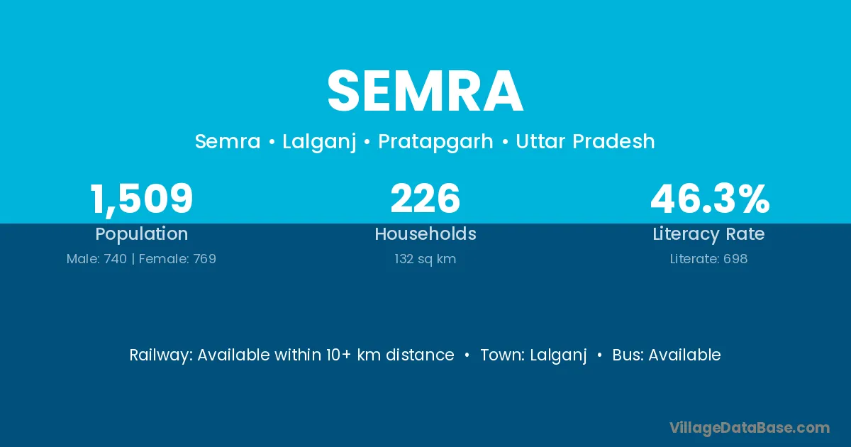 The literacy rate of Semra village is 25.06%. Male literacy stands at 31.59% and female literacy at 17.72%.