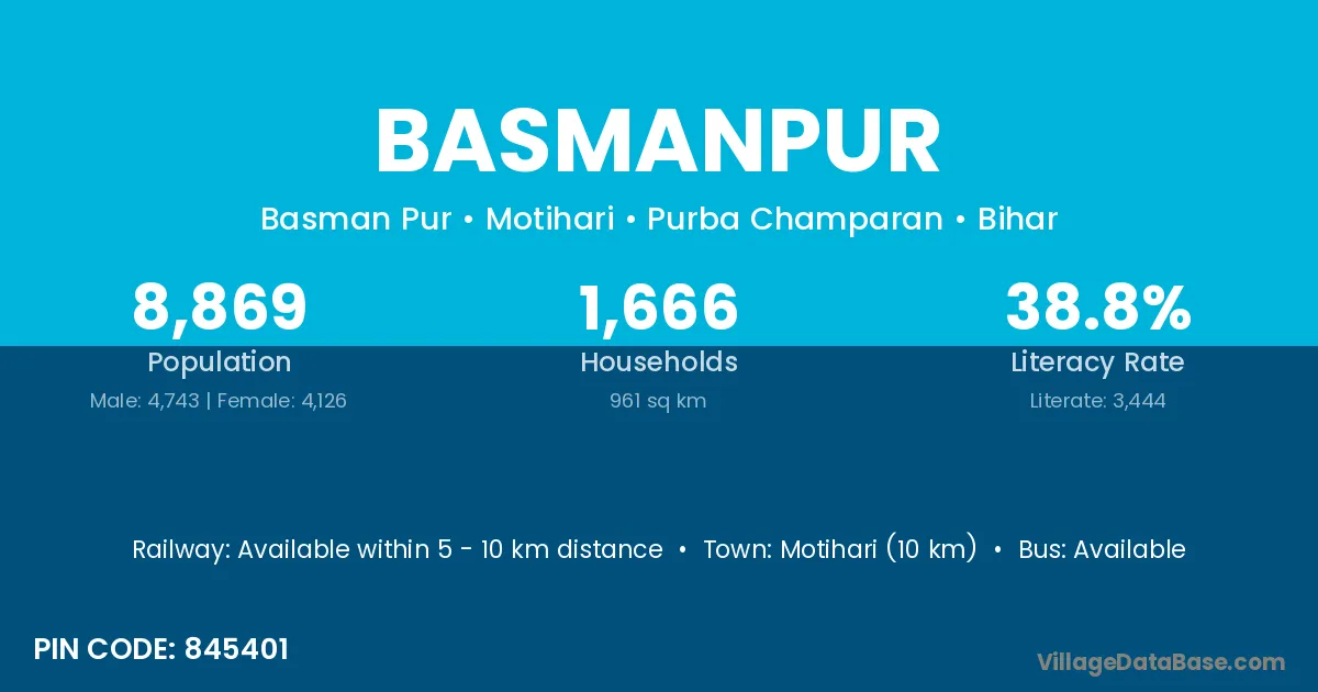 Motihari (10 km) is the nearest town to Basmanpur village for major economic activities and is located approximately 10 km away.