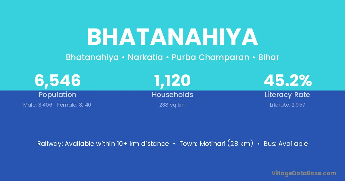 Motihari (28 km) is the nearest town to Bhatanahiya village for major economic activities and is located approximately 28 km away.