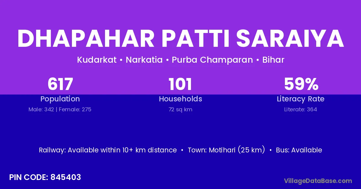Motihari (25 km) is the nearest town to Dhapahar Patti Saraiya village for major economic activities and is located approximately 25 km away.