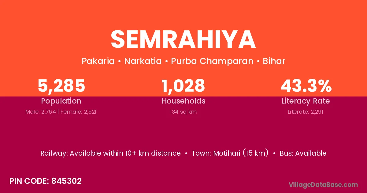 Motihari (15 km) is the nearest town to Semrahiya village for major economic activities and is located approximately 15 km away.