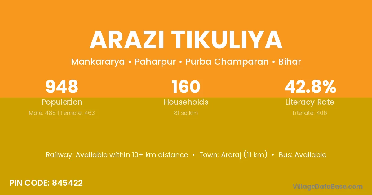 Arazi Tikuliya village has a total population of 948 people, of which 485 are males and 463 are females.