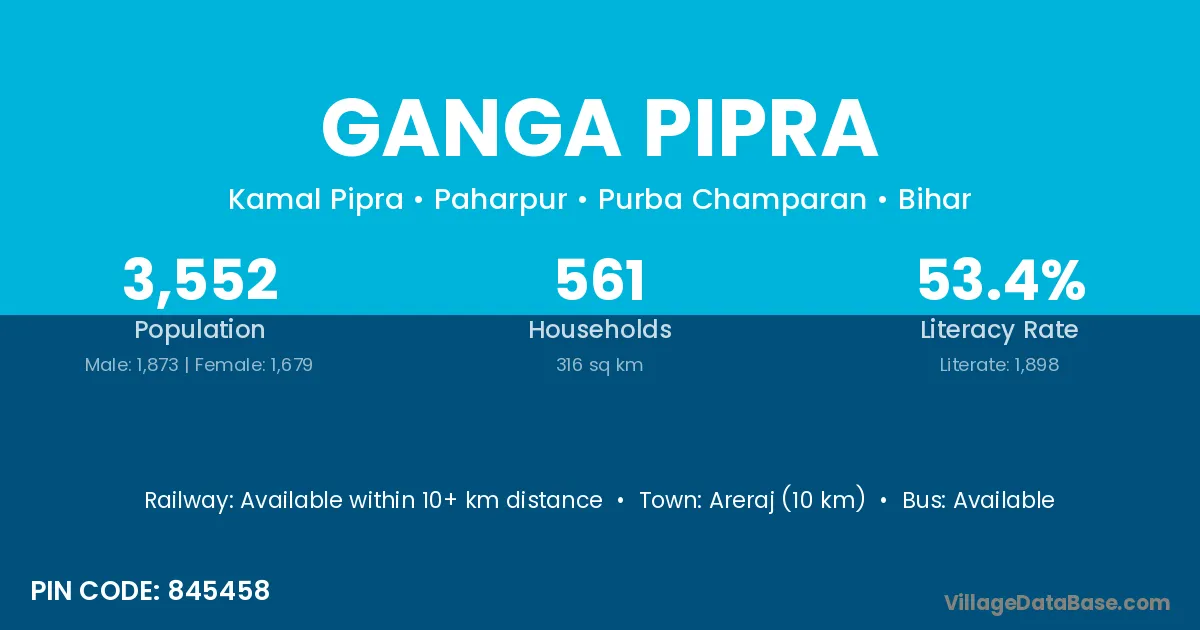 Areraj (10 km) is the nearest town to Ganga Pipra village for major economic activities and is located approximately 10 km away.