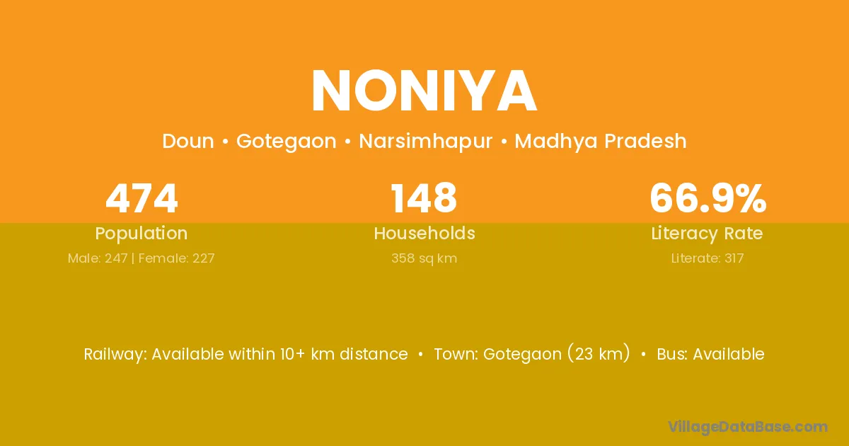 The literacy rate of Noniya village is 49.27%. Male literacy stands at 58.58% and female literacy at 38.91%.