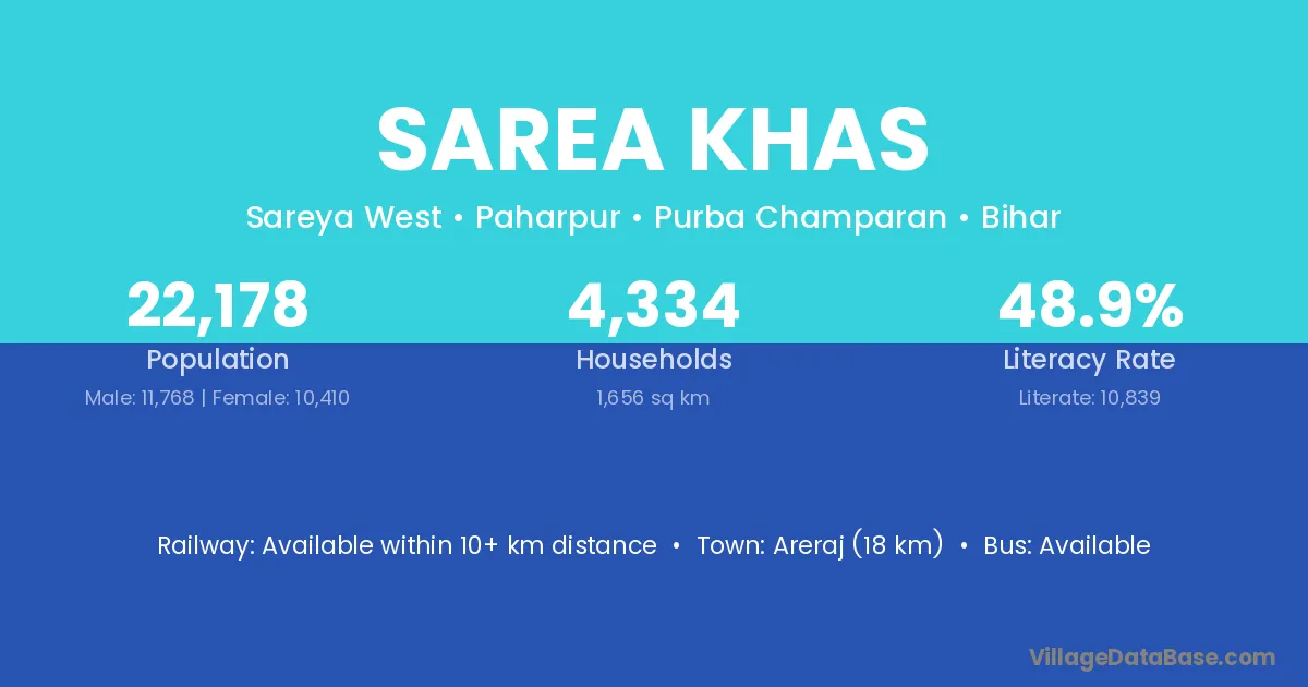 Sarea Khas village has a total population of 22,178 people, of which 11,768 are males and 10,410 are females.