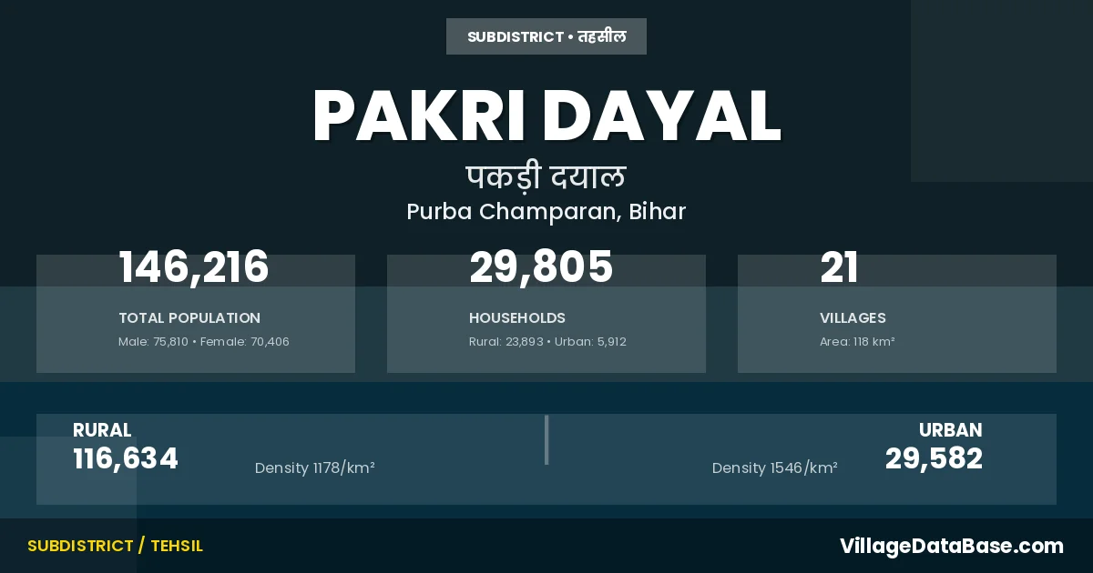 Pakri Dayal is a town and Subdivision in the Purba Champaran district of the Bihar. In India, a Subdivision is a subdivision of a district responsible for the administration and revenue collection of a specific area within the district. Subdivisions play a crucial role in the local governance structure, contributing significantly to the development and administration of their communities.
